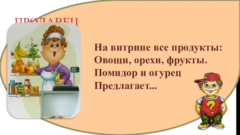 ПРОДАВЕЦНа витрине все продукты:  Овощи, орехи, фрукты. Помидор и огурец Предлагает...