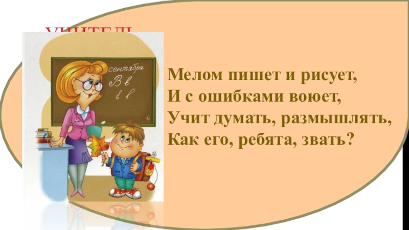 УЧИТЕЛЬМелом пишет и рисует, И с ошибками воюет, Учит думать, размышлять, Как его, ребята, звать?