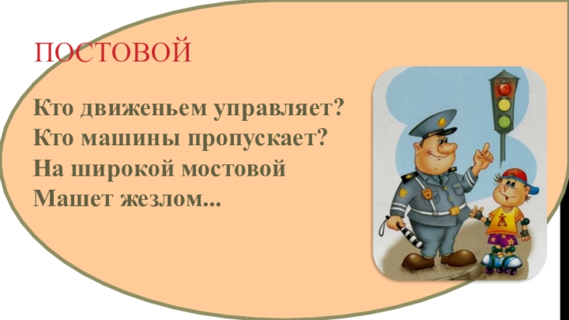 ПОСТОВОЙ Кто движеньем управляет?Кто машины пропускает?На широкой мостовойМашет жезлом...