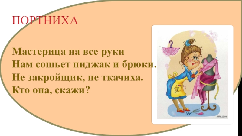 ПОРТНИХА Мастерица на все руки Нам сошьет пиджак и брюки. Не закройщик, не ткачиха. Кто она, скажи?