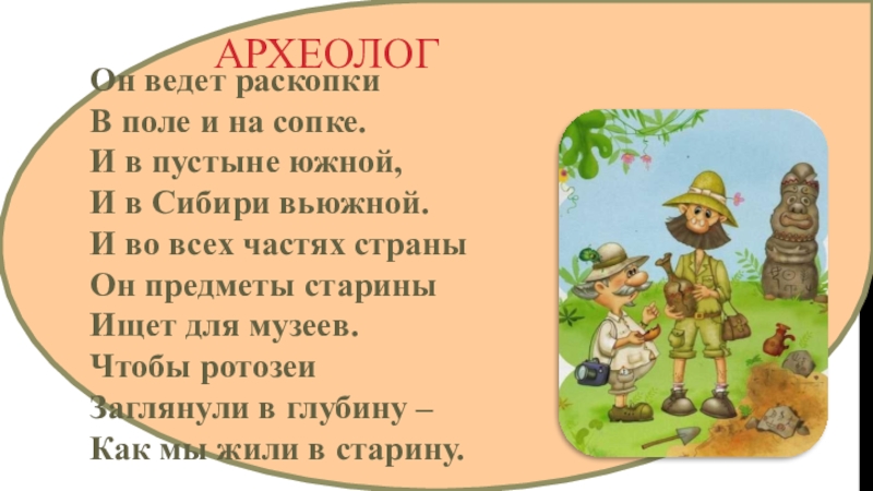 АРХЕОЛОГОн ведет раскопки  В поле и на сопке.  И в пустыне южной,  И в Сибири вьюжной.  И