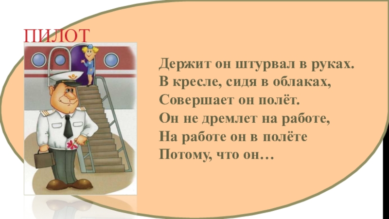ПИЛОТДержит он штурвал в руках.В кресле, сидя в облаках,Совершает он полёт.Он не дремлет на работе,На работе он