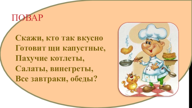 ПОВАРСкажи, кто так вкусноГотовит щи капустные,Пахучие котлеты,Салаты, винегреты,Все завтраки, обеды?