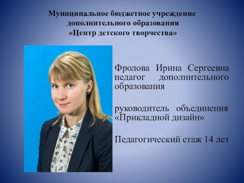 Муниципальное бюджетное учреждение дополнительного образования «Центр детского творчества»Фролова Ирина Сергеевна педагог дополнительного образованияруководитель объединения «Прикладной дизайн»Педагогический стаж 14 лет