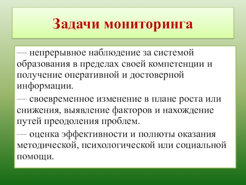 Задачи мониторинга— непрерывное наблюдение за системой образования в пределах своей компетенции и получение оперативной и достоверной информации.—