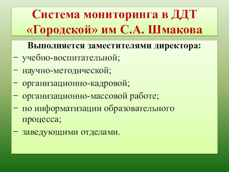 Система мониторинга в ДДТ «Городской» им С.А. ШмаковаВыполняется заместителями директора:учебно-воспитательной;научно-методической;организационно-кадровой; организационно-массовой работе; по информатизации образовательного процесса; заведующими