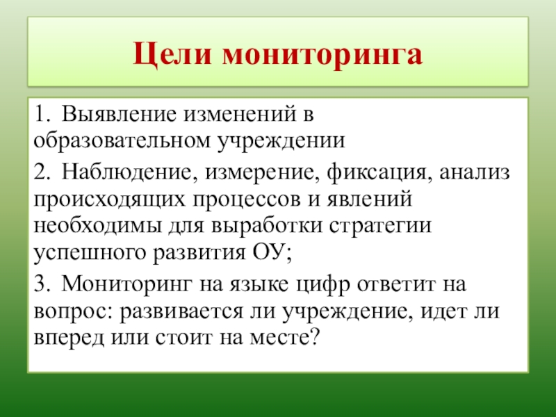 Цели мониторинга1.	Выявление изменений в   образовательном учреждении 2.	Наблюдение, измерение, фиксация, анализ происходящих процессов и явлений необходимы