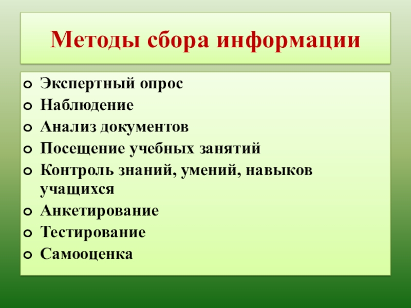 Методы сбора информацииЭкспертный опросНаблюдениеАнализ документовПосещение учебных занятийКонтроль знаний, умений, навыков учащихсяАнкетированиеТестированиеСамооценка
