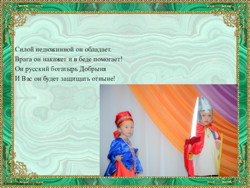 Силой недюжинной он обладает.Врага он накажет и в беде помогает!Он русский богатырь ДобрыняИ Вас он будет защищать
