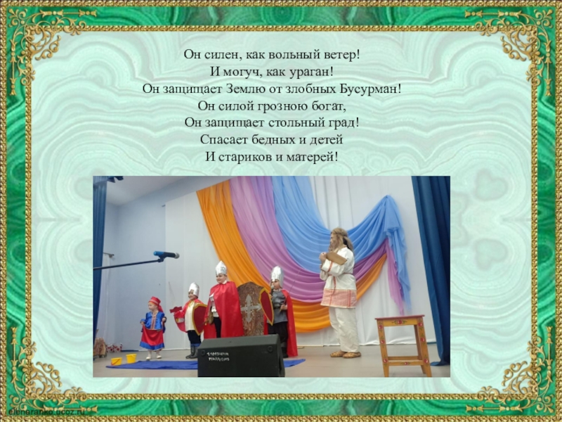 злобных Бусурман! Он силой грозною богат, Он защищает стольный град! Спасает бедных и детей И стариков и матерей!