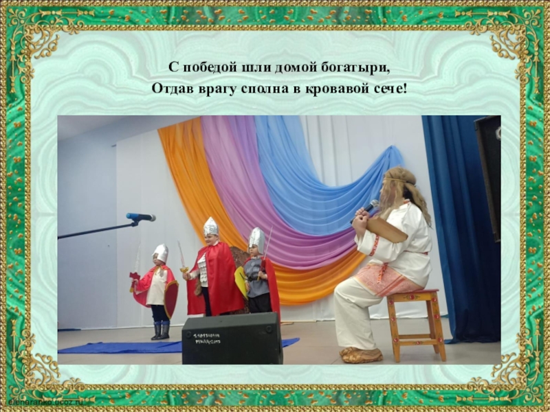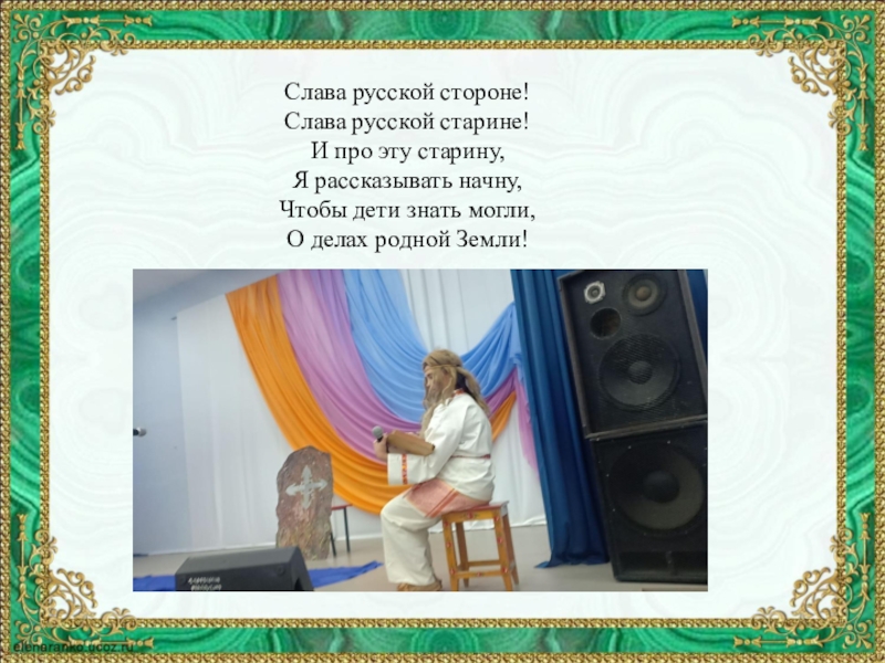 Слайд 2Слава русской стороне! Слава русской старине! И про эту старину, Я рассказывать начну, Чтобы дети