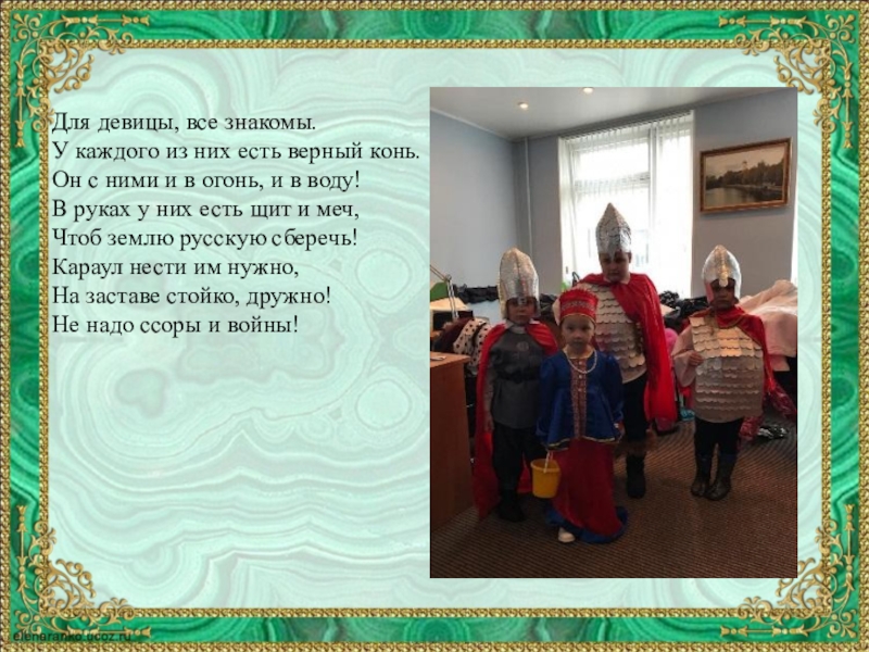ними и в огонь, и в воду! В руках у них есть щит и меч, Чтоб землю русскую сберечь! Караул нести им нужно, На заставе стойко, дружно! Не надо ссоры и войны!