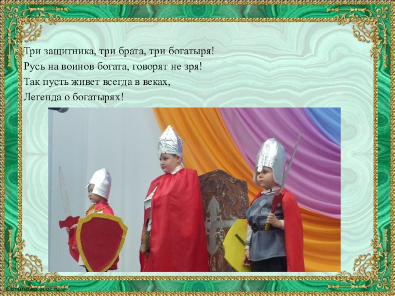Три защитника, три брата, три богатыря!Русь на воинов богата, говорят не зря!Так пусть живет всегда в веках,Легенда