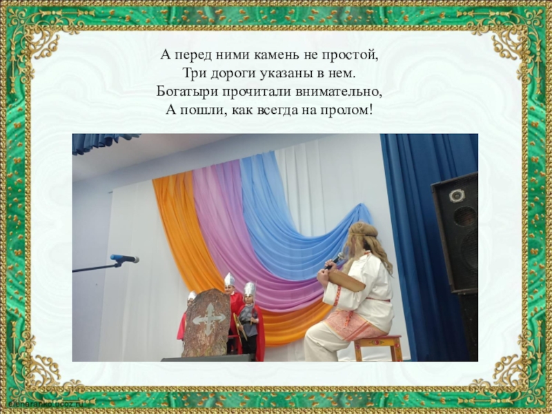 А перед ними камень не простой,Три дороги указаны в нем.Богатыри прочитали внимательно,А пошли, как всегда на пролом!
