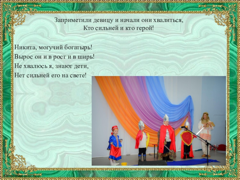 Заприметили девицу и начали они хвалиться, Кто сильней и кто герой! Никита, могучий богатырь!Вырос он и в