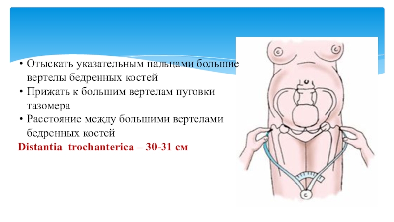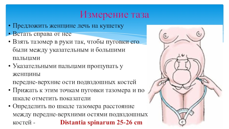 Определить по шкале тазомера расстояние между передне-верхними остями подвздошных костей - Distantia spinarum 25-26 cm