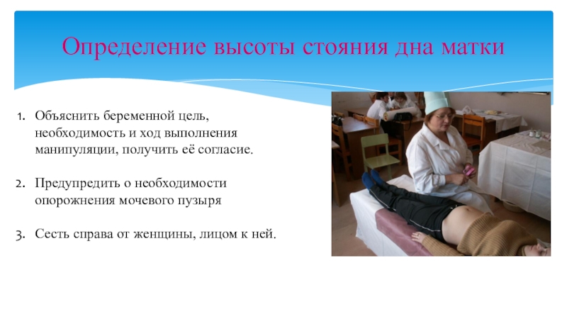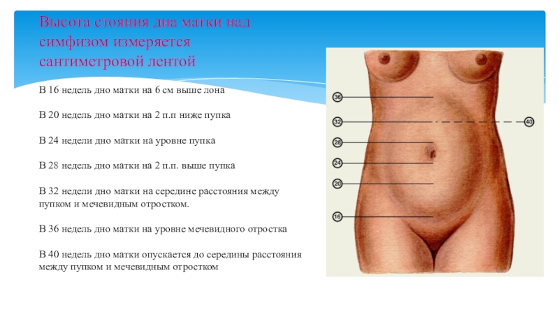 Сантиметровой лентой измеряют расстояние между верхним краем симфиза и наиболее выдающейся точкой дна матки. Это будет высота стояния дна матки над лобком.