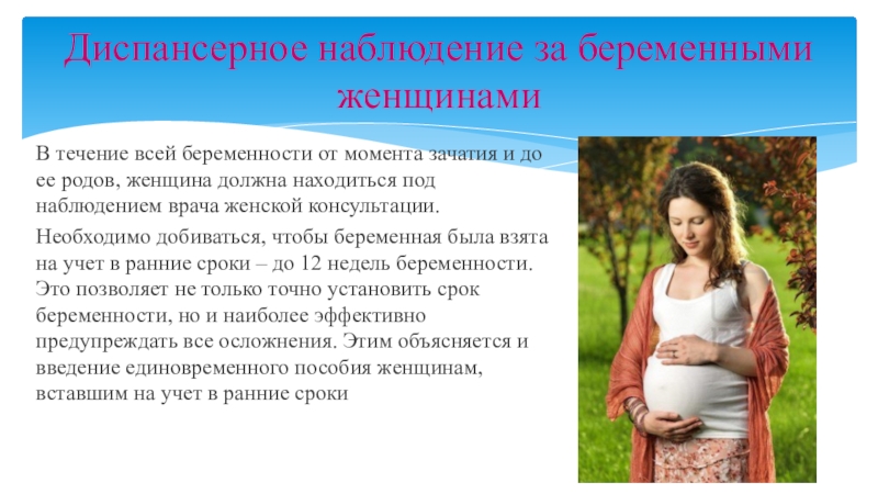 Необходимо добиваться, чтобы беременная была взята на учет в ранние сроки – до 12 недель беременности. Это позволяет не только точно установить срок беременности, но и наиболее эффективно предупреждать все осложнения. Этим объясняется и введение единовременного пособия женщинам, вставшим на учет в ранние сроки