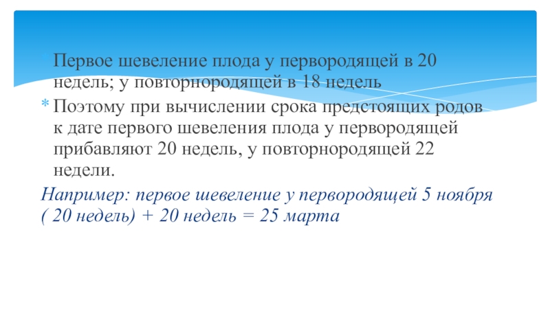 Поэтому при вычислении срока предстоящих родов к дате первого шевеления плода у первородящей прибавляют 20 недель, у повторнородящей 22 недели.