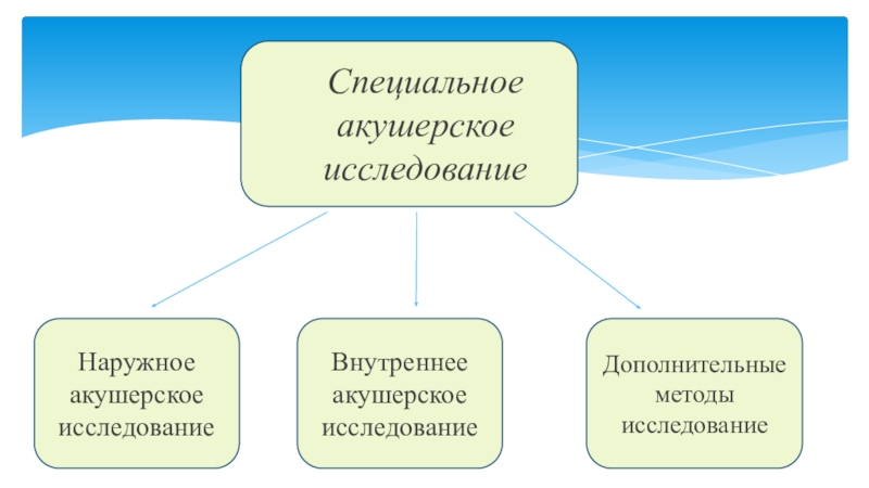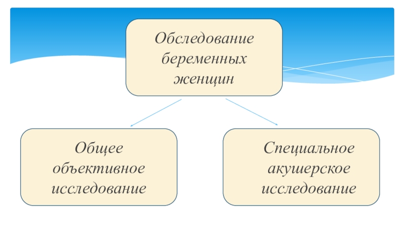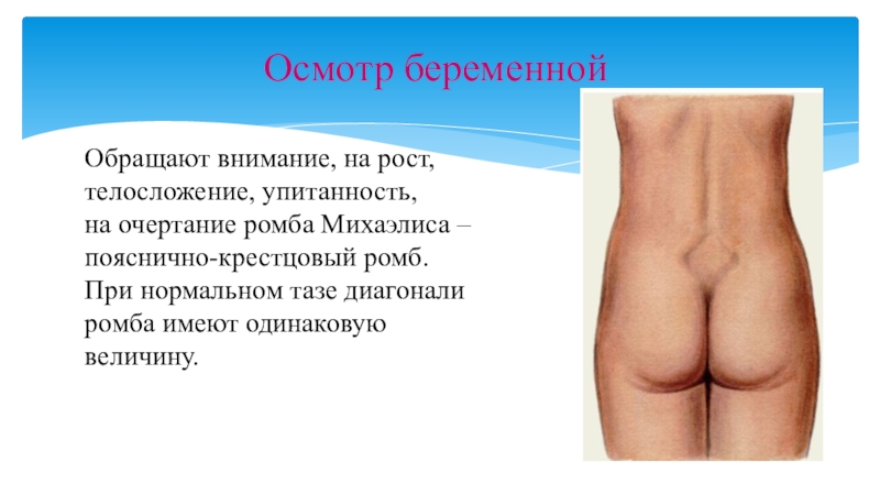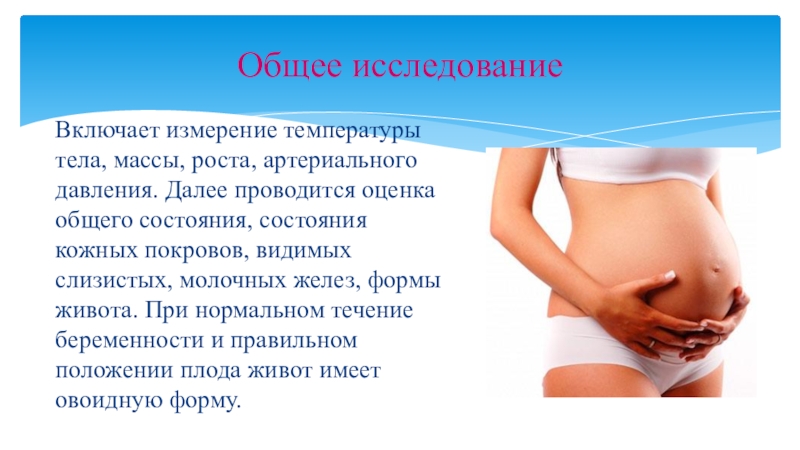общего состояния, состояния кожных покровов, видимых слизистых, молочных желез, формы живота. При нормальном течение беременности и правильном положении плода живот имеет овоидную форму.