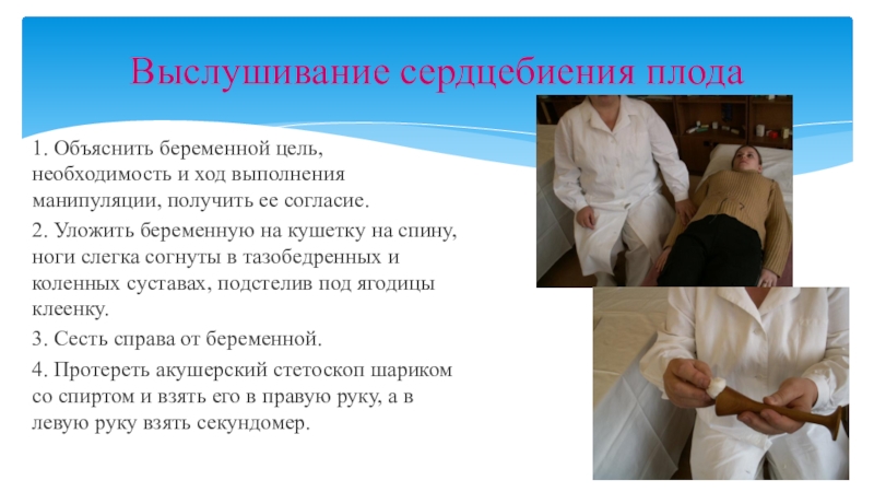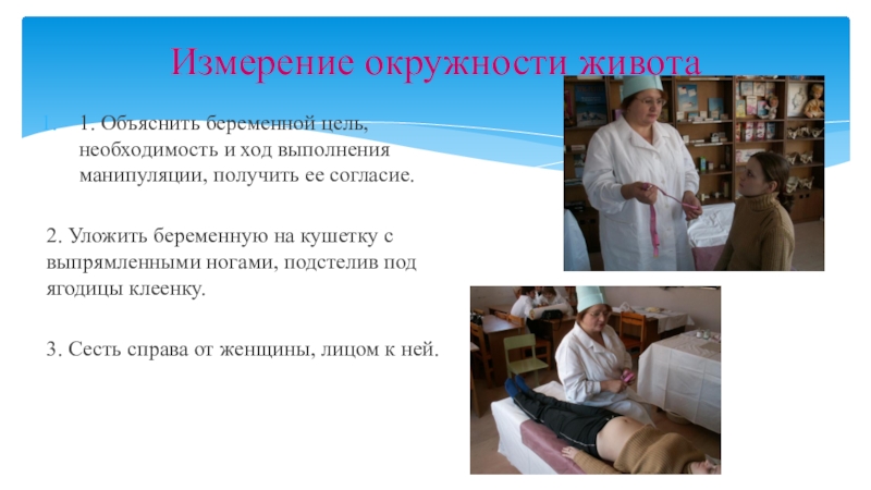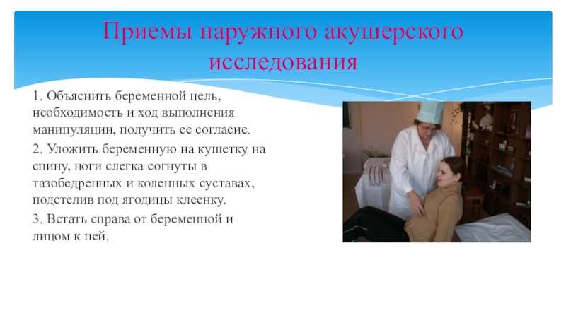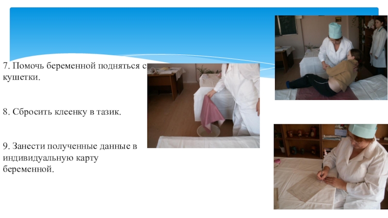 Слайд 291. Объяснить беременной цель, необходимость и ход выполнения манипуляции, получить ее