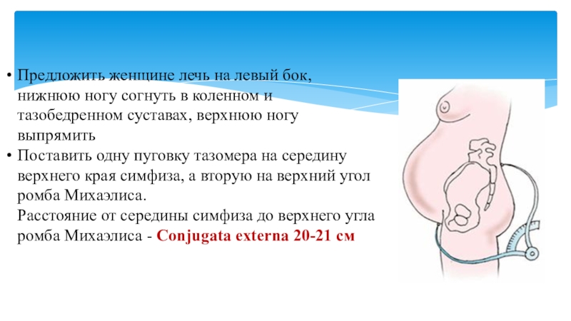 Слайд 23Предложить женщине лечь на левый бок, нижнюю ногу согнуть в коленном