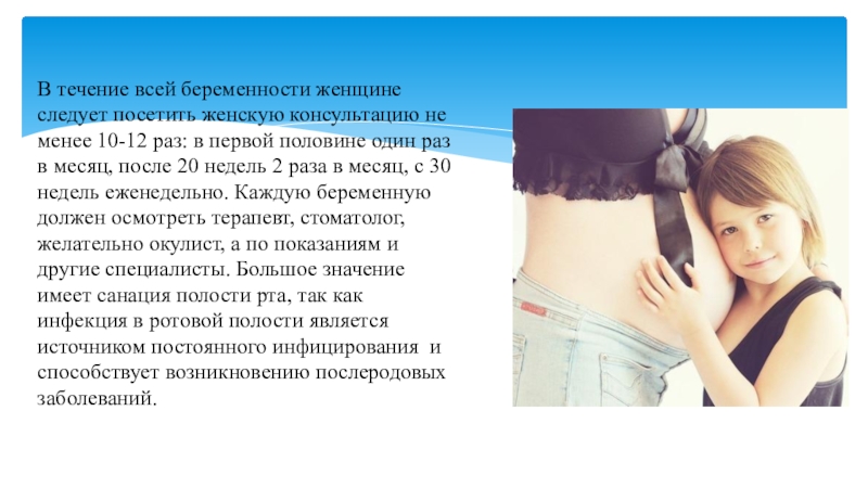Слайд 13В течение всей беременности женщине следует посетить женскую консультацию не менее