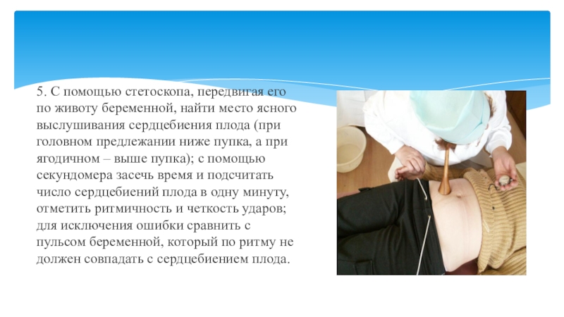 Слайд 355. С помощью стетоскопа, передвигая его по животу беременной, найти место