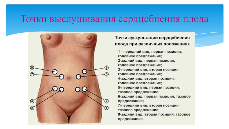 ясного выслушивания сердцебиения плода (при головном предлежании ниже пупка, а при ягодичном – выше пупка); с помощью секундомера засечь время и подсчитать число сердцебиений плода в одну минуту, отметить ритмичность и четкость ударов; для исключения ошибки сравнить с пульсом беременной, который по ритму не должен совпадать с сердцебиением плода.