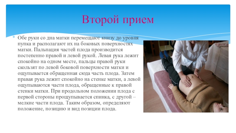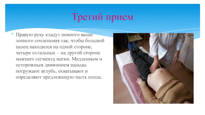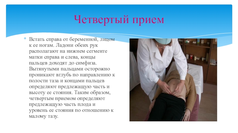 располагают на нижнем сегменте матки справа и слева, концы пальцев доходят до симфиза. Вытянутыми пальцами осторожно проникают вглубь по направлению к полости таза и концами пальцев определяют предлежащую часть и высоту ее стояния. Таким образом, четвертым приемом определяют предлежащую часть плода и уровень ее стояния по отношению к малому тазу.