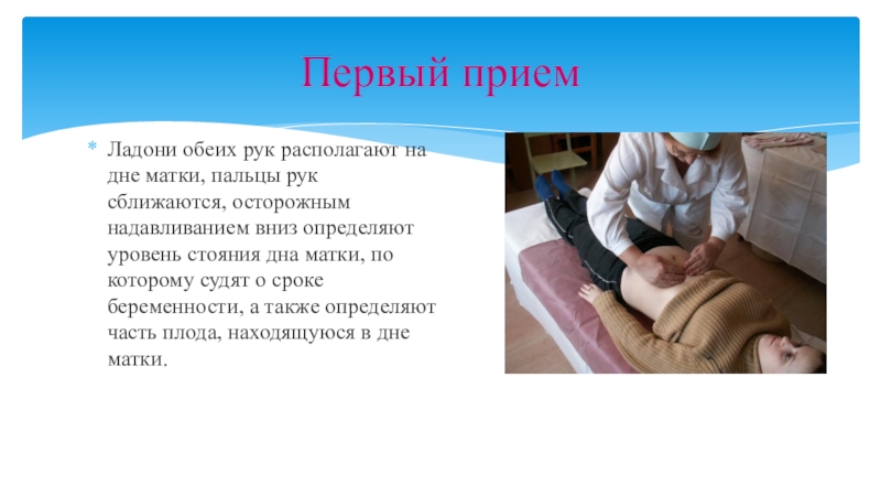 надавливанием вниз определяют уровень стояния дна матки, по которому судят о сроке беременности, а также определяют часть плода, находящуюся в дне матки.