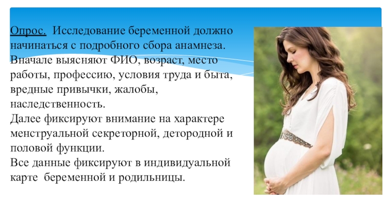 Слайд 16Опрос. Исследование беременной должно начинаться с подробного сбора анамнеза.
