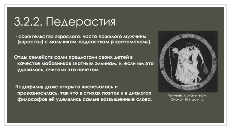 Позорным считался акт совокупления двух взрослых партнеров., т.к. более старший любовник играет некую роль отца: он помогает возлюбленному развиваться, чтобы войти во взрослую жизнь настоящим мужчиной.