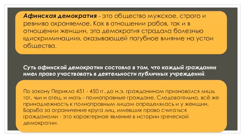в отношении рабов, так и в отношении женщин, эта демократия страдала болезнью «дискриминации», оказывающей пагубное влияние на устои общества.