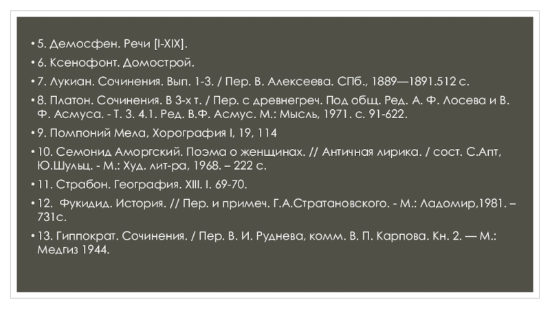 13. Гиппократ. Сочинения. / Пер. В. И. Руднева, комм. В. П. Карпова. Кн. 2. — М.: Медгиз 1944.