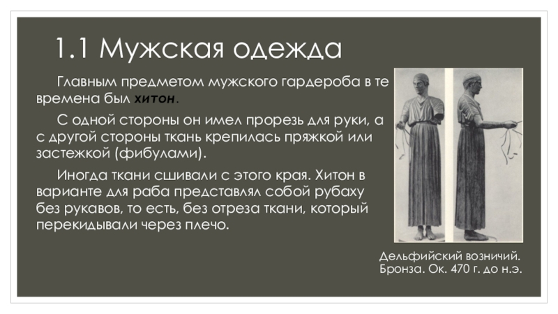 Иногда ткани сшивали с этого края. Хитон в варианте для раба представлял собой рубаху без рукавов, то есть, без отреза ткани, который перекидывали через плечо.