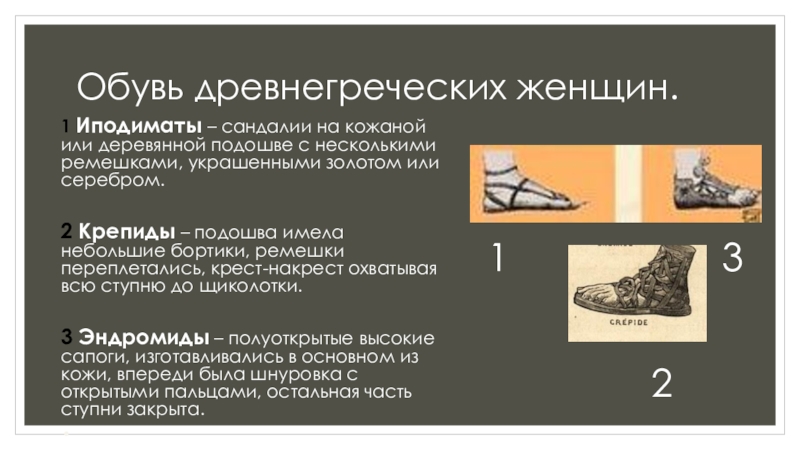 2 Крепиды – подошва имела небольшие бортики, ремешки переплетались, крест-накрест охватывая всю ступню до щиколотки.