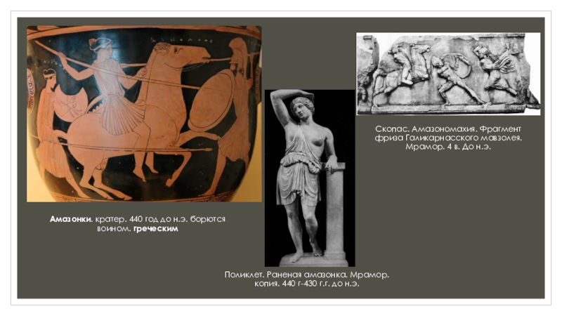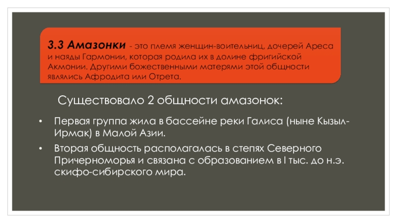 3.3 Амазонки - это племя женщин-воительниц, дочерей Ареса и наяды Гармонии, которая родила их в долине фригийской Акмонии. Другими божественными матерями этой общности являлись Афродита или Отрета.