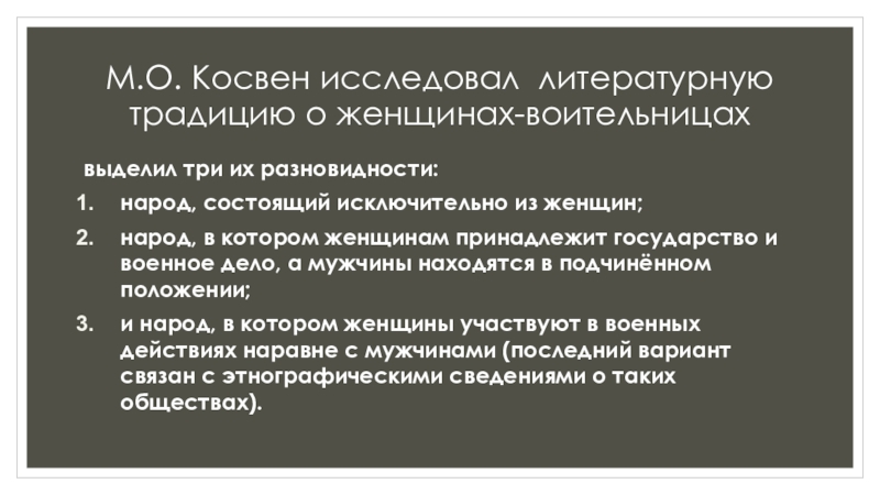 Слайд 40М.О. Косвен исследовал литературную традицию о женщинах-воительницах
