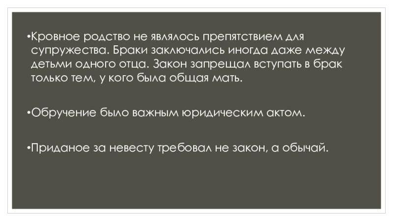 Слайд 15Кровное родство не являлось препятствием для супружества. Браки заключались иногда даже