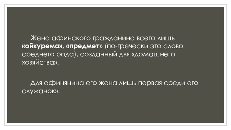 Слайд 18 Жена афинского гражданина всего лишь «ойкурема», «предмет» (по-гречески это слово среднего