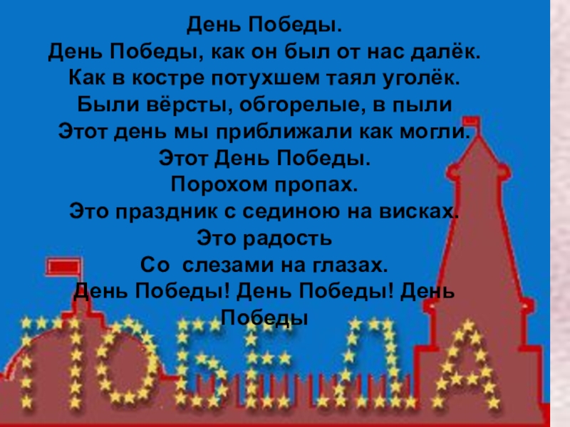 День Победы.День Победы, как он был от нас далёк.Как в костре потухшем таял уголёк.Были вёрсты, обгорелые, в