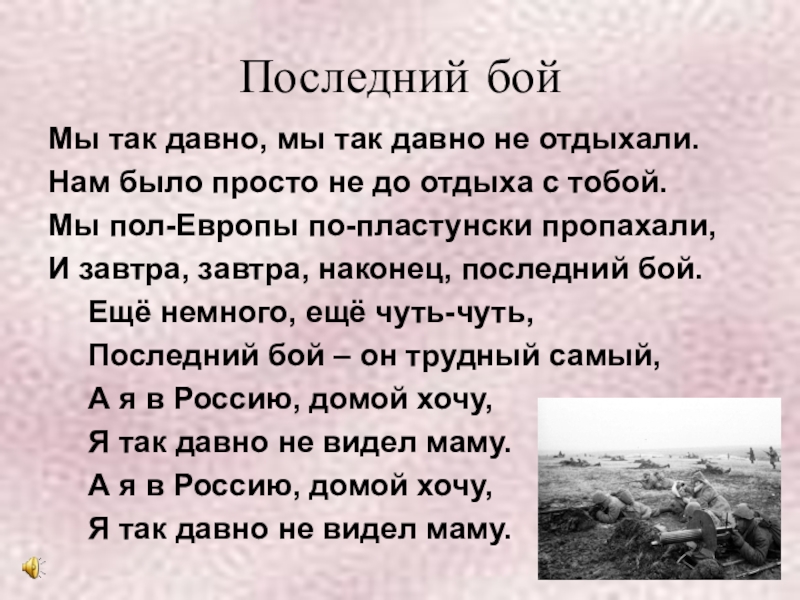 Последний бойМы так давно, мы так давно не отдыхали.Нам было просто не до отдыха с тобой.Мы пол-Европы