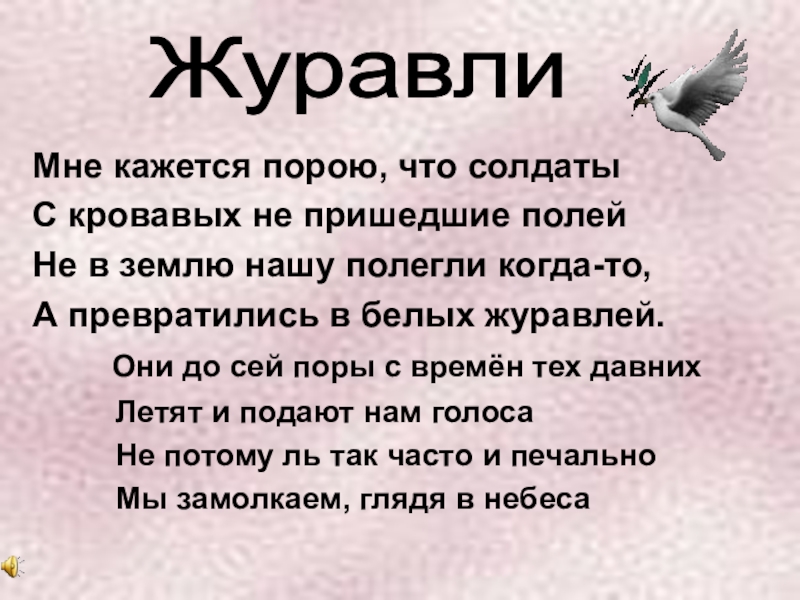Журавли Мне кажется порою, что солдатыС кровавых не пришедшие полейНе в землю нашу полегли когда-то,А превратились в