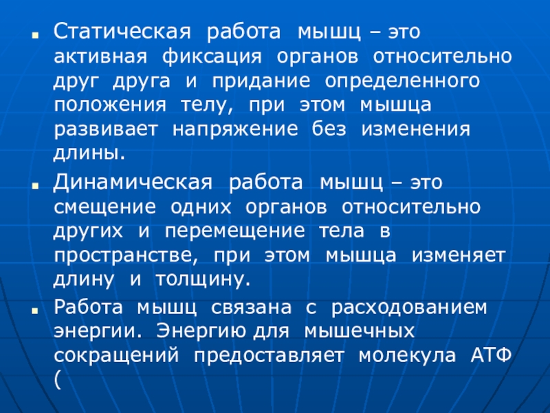 Динамическая работа мышц – это смещение одних органов относительно других и перемещение тела в пространстве, при этом мышца изменяет длину и толщину.
