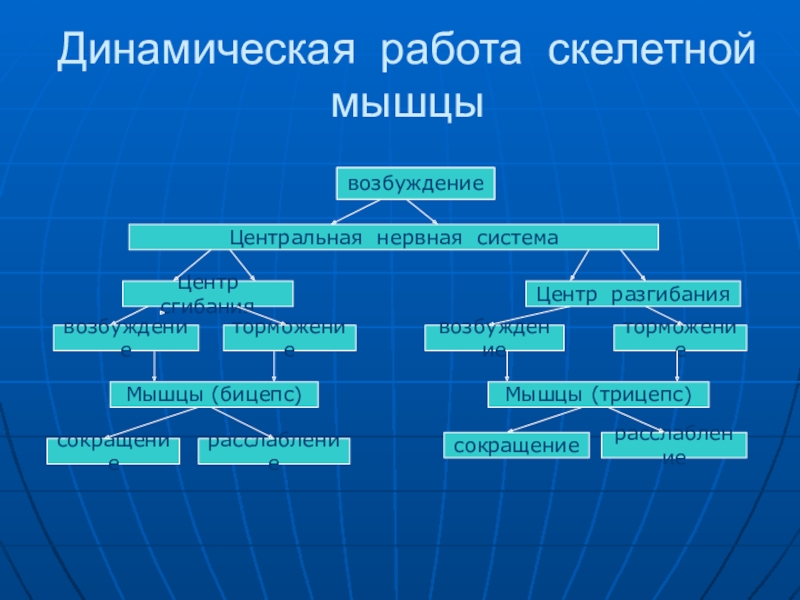 Динамическая работа скелетной мышцывозбуждениеЦентральная нервная системаЦентр сгибанияЦентр разгибаниявозбуждениеторможениеторможениевозбуждениеМышцы (бицепс)Мышцы (трицепс)сокращениерасслаблениесокращениерасслаблениевозбуждение