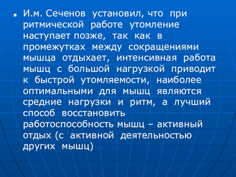 И.м. Сеченов установил, что при ритмической работе утомление наступает позже, так как в промежутках между сокращениями мышца