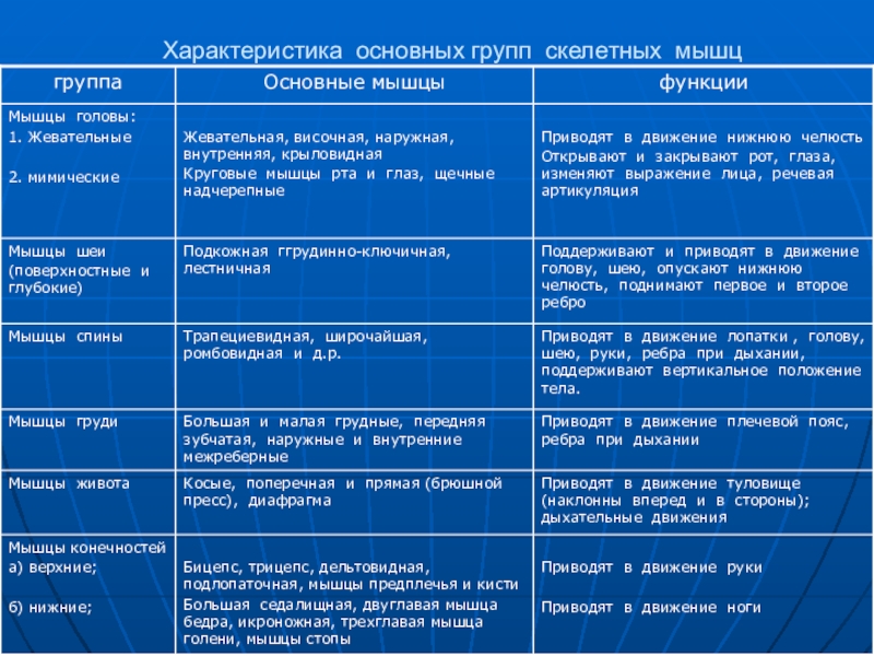 Слайд 5Характеристика основных групп скелетных мышц