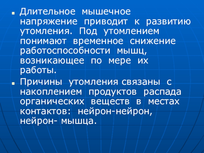 Длительное мышечное напряжение приводит к развитию утомления. Под утомлением понимают временное