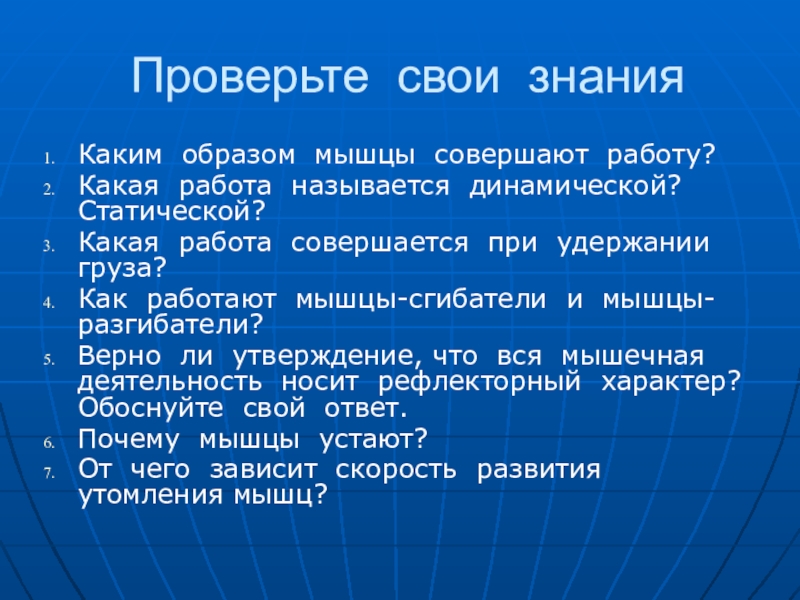 Проверьте свои знанияКаким образом мышцы совершают работу?Какая работа называется динамической? Статической?Какая работа совершается при удержании груза? Как